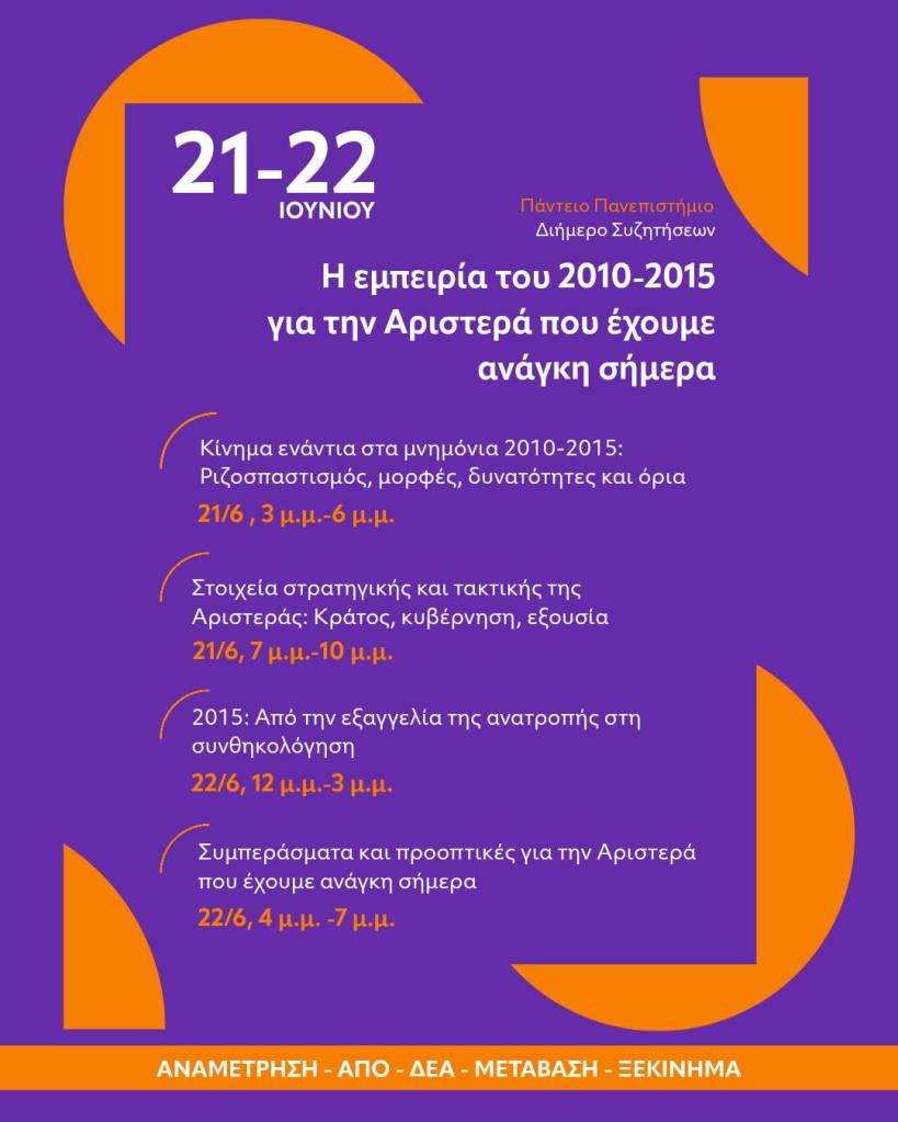 - 10 χρόνια μετά συζητάμε για την περίοδο 2010 – 2015, για την ιστορική κλιμάκωση της μαζικής κοινωνικής κινητοποίησης και δράσης, από το εργατικό κίνημα και τις δεκάδες γενικές απεργίες, τις “πλατείες” και τις μαζικές διαδηλώσεις στο Σύνταγμα μέχρι την οργάνωση απ’ τα κάτω λαϊκών συνελεύσεων και δικτύων αλληλεγγύης. Για την κοινωνική διεργασία που απέδωσε ένα τέτοιο μέγεθος κλιμάκωσης της πάλης, και για την οξύτατη οικονομική και κοινωνική κρίση εκείνης της περιόδου εντός της οποίας δημιουργήθηκε. Συζητάμε για τις τότε πολιτικές και προγραμματικές επιλογές των βασικών αριστερών ρευμάτων και δυνάμεων. Συζητάμε κριτικά και αυτοκριτικά για το κοινωνικό και πολιτικό ρεύμα που οδήγησε στην κυβέρνηση ΣΥΡΙΖΑ, για τις ελπίδες που γέννησε αλλά και τη μνημονιακή μετάλλαξή της.